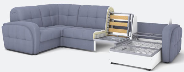 Огромный выбор размеров и типов модулей позволяет составить диван для любого помещения. На диване удобно сидеть и спать: механизм аккордеон при раскладывании образует высокое ровное спальное место, по комфорту сравнимое с настоящими кроватями. Все модули могут быть исполнены с матрасами ППУ или НПБ высотой 12 см (исключение угловая секция — только с НПБ).