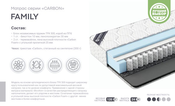 Модель на основе ортопедического блока TFK 500, подходящая широкому кругу пользователей как по допустимой максимальной весовой нагрузке, так и по уровню комфорта. Применение материала «Bicotton» в качестве наполнителя, распределяющего нагрузку, с одной стороны матраса делает его упругим и жестким. Сочетание с другой стороны термовойлока и угольной пены высокой плотности «Сarbon Foam» будет менее жестким и более комфортным.
