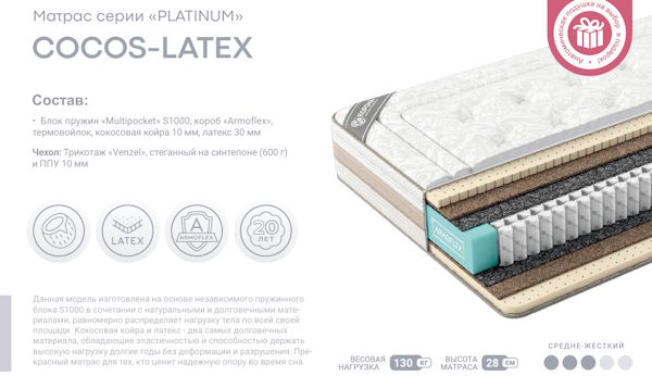 Данная модель изготовлена на основе независимого пружинного блока S1000 в сочетании с натуральными и долговечными материалами, равномерно распределяет нагрузку тела по всей своей площади. Кокосовая койра и латекс - два самых долговечных материала, обладающие эластичностью и способностью держать высокую нагрузку долгие годы без деформации и разрушения. Прекрасный матрас для тех, кто ценит надежную опору во время сна.