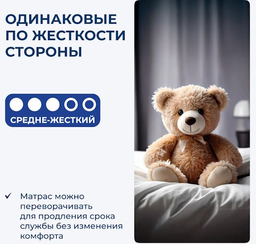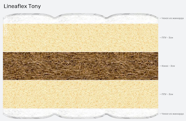Детский матрас Toni – беспружинная модель с высокими анатомическими свойствами. Благодаря эластичной пене Ergoflex, которая входит в состав изделия, форма не подлежит деформации и способна адаптироваться под тело и вес ребенка. Не менее великолепный материал, придающий оздоровительную жесткость матрасу – кокосовая койра. Она антиалергенна, антистатична и микробам сквозь нее не пройти.