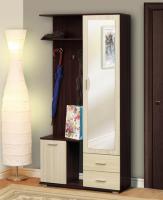 В комплектацию прихожей Кармен-1 входят открытая вешалка с крючками, небольшая секция с распашной дверцей с зеркалом, полка для головных уборов, два выдвижных ящика.