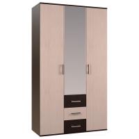 Модель имеет отделение с хромированной штангой для одежды на вешалках, три выдвижных ящика, а также зону с полками, на центральный фасад прикреплено высокое зеркало, изделие выполнено из ЛДСП, модель дополнена эргономичными ручками.