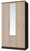 Центральная створка у модели – зеркальная, под ней находятся два выкатных ящика, внутренняя комплектация состоит из отделений с хромированными штангами и зоны с полками для хранения трикотажа или белья, шкаф выполнен в комбинации цветов венге и лоредо.