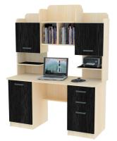 Нижняя часть стола имеет две тумбы и полку посередине. Слева внизу расположен удобный закрытый шкафчик с распашной дверцей и двумя отделениями внутри. В правой части стола имеются 3 удобных вместительных ящика, плавно передвигающихся на шариковых направляющих и имеющие полное выдвижение. При этом нижний ящик значительно больше двух верхних, что является большим преимуществом. Посередине под столешницей расположена удобная полка для книг.