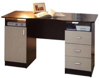 Письменный стол «Меркурий» оснащёндвумя тумбами, что позволяет удобно выполнять различные виды работ и хранить значительное количество бумаг и предметов. Расстояние между тумбами составляет 560 мм. Рабочая поверхность имеет большую площадь, эстетике изделия способствуют скруглённые углы. Слева расположена секция, скрытая за глухой дверцей. Справа размещены три выдвижных ящика. По бокам выполнены полые ниши, обеспечивающие удобство расположения часто используемых предметов. Основной корпус оформлен в тёмной цветовой гамме, фасады – в светлой.
