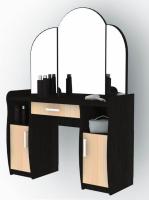 Привычные формы, элегантность, большое количество удобных полочек - все это в туалетном столике Галант-2. Конструкция модели состоит из трёх зеркал, образующих благодаря подвижной конструкции обзор со всех сторон. В центральной части находится выдвижной ящик для косметики и аксессуаров. По обеим сторонам столика - закрытые тумбы с распашными дверцами и полками. Над ними расположены вместительные полуоткрытые ниши. Туалетный столик выполнен в классическом стиле, имеет симметричные формы и прекрасно дополнит любой интерьер.