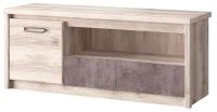 Прямая тумба JAZZ RTV 1D1SN изготовлена на белорусской мебельной фабрике Anrex из ЛДСП. В ее конструкцию входит широкий выдвижной ящик, распашная дверь и открытая ниша для аудиотехники. Для удобства открывания на створке установлены черные металлические ручки Boyard. По торцам дверцы проходит фаска – небольшой скос, который делает край более аккуратным и выразительным.