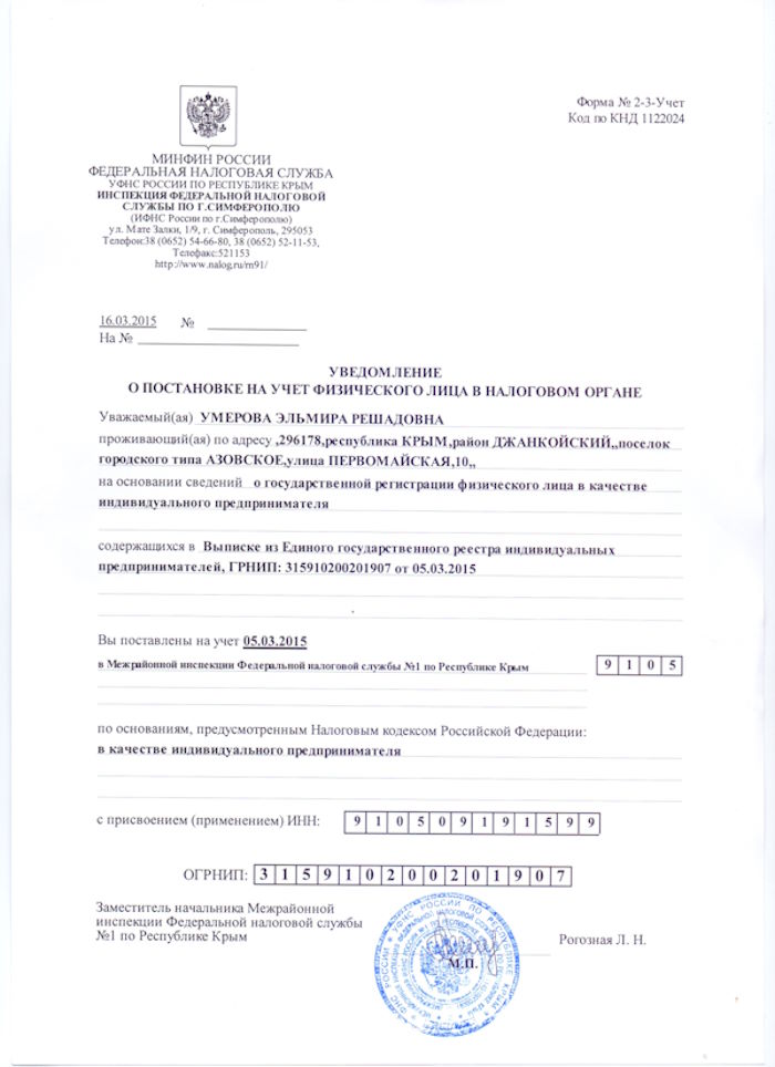 Свидетельство о регистрации ИП Умерова Э.Р.
